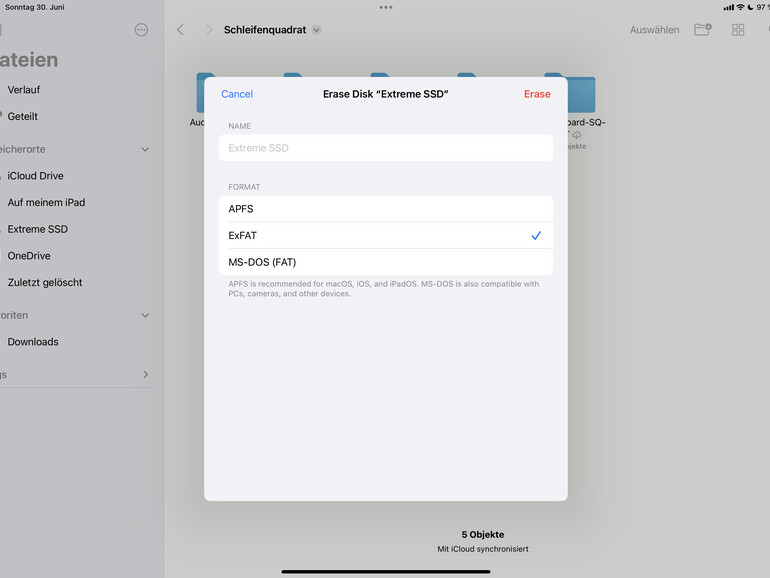 Die Möglichkeit, externe Speichermedien in die Dateien-App einzubinden, hat das iPad für viele ein Stück weit mehr zum Mac-Ersatz werden lassen. Eine der bislang fehlenden Optionen für den Umgang mit angeschlossenem Speicher war das Löschen, das Formatieren ebendieses. Mit iPadOS 18 kannst du in der „Dateien-App den Eintrag für etwa deine externe SSD gedrückt halten und dann den Löschen-Dialog aufrufen. Hier kannst du dann sogar wählen, ob du den Speicher in Apples APFS oder in Windows-kompatibel formatieren möchtest. Daumen hoch!