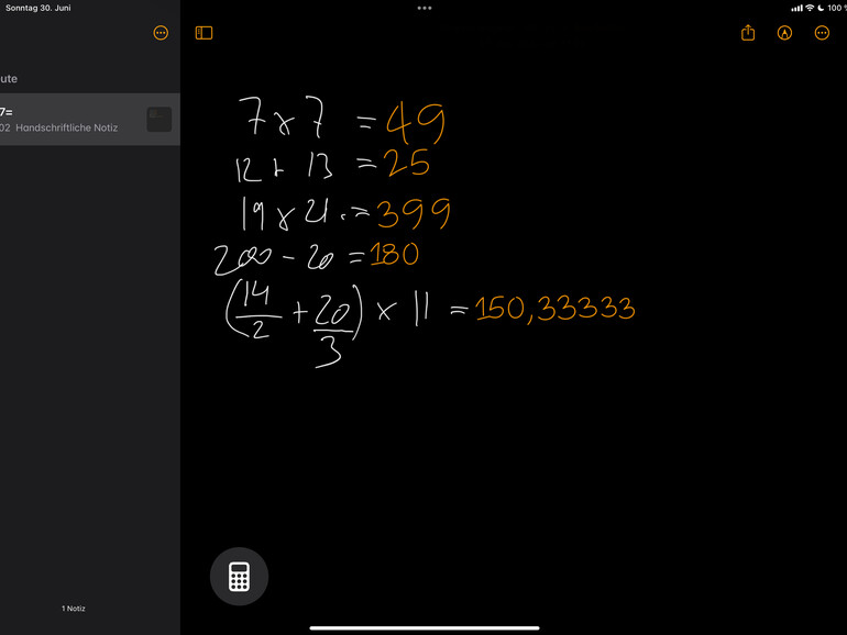 Eine der beeindruckendsten Demonstrationen während der WWDC-Keynote war sicherlich die Vorstellung von Math Notes oder zu Deutsch „mathematischen Notizen“. Nicht nur, dass Apple dem iPad mit iPadOS 18 tatsächlich endlich eine Taschenrechner-App spendiert, sie versteht sich auch auf handschriftliche Rechenaufgaben und ergänzt die Ergebnisse nach dem Setzen eines Gleichheitszeichens automatisch. Das funktioniert schon jetzt fantastisch gut, selbst dann, wie im Screenshot zu sehen, wenn die Ästhetik der Handschrift zu wünschen übrig lässt.