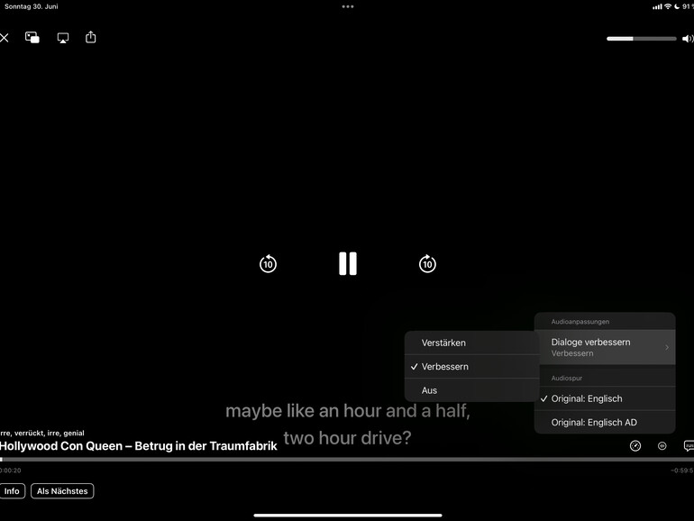 Ein ewiges Leid in Filmen und Serien, vor allem im Originalton, der live während des Drehs der Szene abgenommen und eben nicht im Nachgang im Synchronstudio aufgezeichnet wird, ist die mitunter schwierige Verständlichkeit von Dialogen. In der Apple-TV-App erhältst du mit iPadOS 18 die Möglichkeit, Dialoge zu „Verstärken“ oder zu „Verbessern“. Das funktioniert tatsächlich, einen echten Unterschied zwischen diesen beiden Optionen konnten wir bislang allerdings noch nicht ausmachen. Das mag entweder an unseren Ohren oder aber am Beta-Stadium der Software liegen. So oder so: Wenn du mal wieder das Gefühl hast, dich allzu sehr auf das gesprochene Wort konzentrieren zu müssen – gib „Dialoge verbessern“ einfach eine Chance.