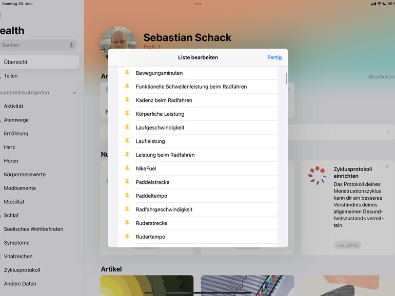 Es hat eine ganze Zeit gedauert, bis Apple die Health-App auf das iPad gebracht hat. In diesem Jahr wird sie noch nützlicher. So kannst du im obersten Segment der Startseite nun favorisierte Werte anpinnen, sodass du sie immer auf einen Blick sehen kannst, sobald du die App gestartet hast. Dieser Schritt ist unbedingt sinnvoll, weil die Health-App schnell über einen unübersichtlich großen Fundus an Daten verfügt, der es einem schwer macht, noch den sprichwörtlichen Wald vor lauter Bäumen zu sehen. Hier für mehr Ordnung zu sorgen, ist ein klarer Zugewinn.