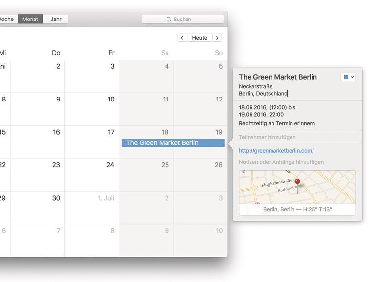 Ergänzen Sie einen Termin um einen Treffpunkt in Form eines Straßennamens und einer Stadt, stellt Kalender diesen Ort auf einem Kartenausschnitt dar. Doch damit nicht genug: Auf Wunsch können Sie eine Webadresse, einen Anhang oder einige Notizen ergänzen und weitere Teilnehmer einladen.