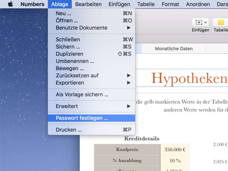 Öffnen Sie zunächst die Tabelle, die Sie mit einem Passwort versehen möchten, in Numbers. Klicken Sie nun in der Menüleiste am oberen Bildschirmrand auf „Ablage" und wählen Sie „Passwort festlegen" aus.