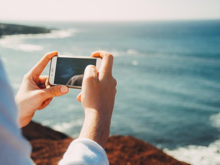 Nach der Texteingabe können Sie entweder ein weiteres Mal auf das „T“-Icon tippen, um Ihren Film weiter zu bearbeiten oder Sie schließen ihn ab, indem Sie oben links auf „Fertig“ tippen. Tippen Sie nun am unteren Bildschirmrand auf das Teilen-Symbol. Hier können Sie den Film als Video in der Fotos-App speichern, ihn in einen Cloudspeicher oder auf eine Social-Media-Plattform (sofern die zugehörige App installiert ist) laden.