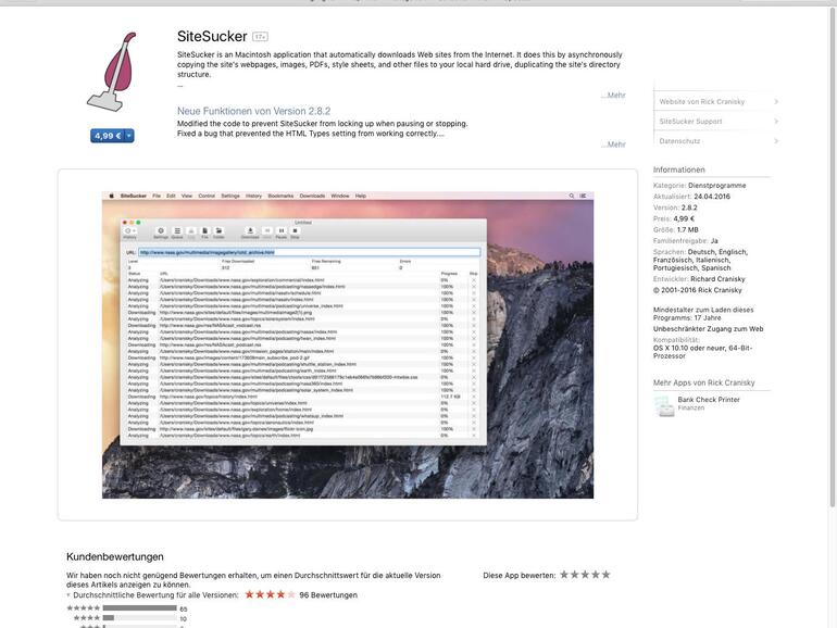Öffnen Sie den App Store und geben Sie ins Suchfeld „SiteSucker“ ein. Haben Sie die App gefunden, klicken Sie auf das Preisschild, um sie zu erwerben. Sie finden sie anschließend im Ordner „Programme“.