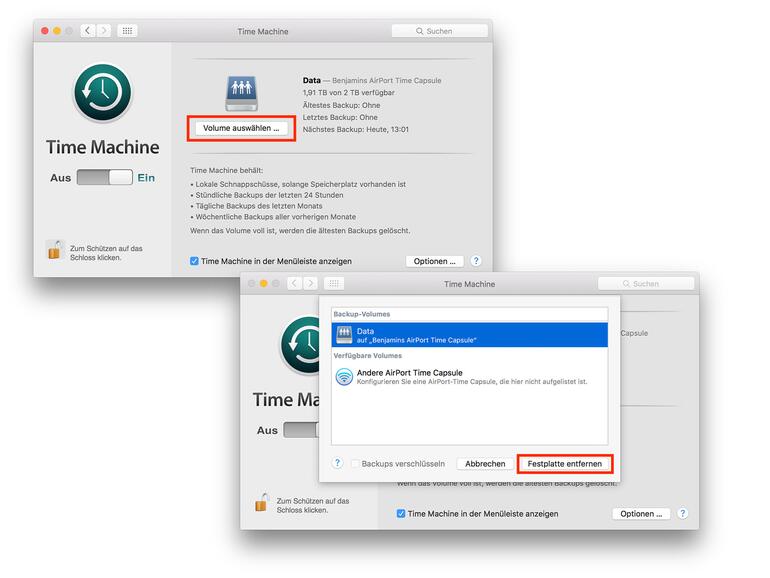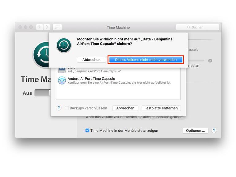 Um ein Backup-Laufwerk aus der Time Machine zu entfernen, muss es übrigens nicht angeschlossen sein.