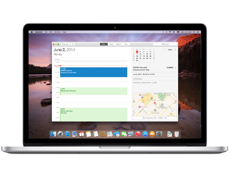 Wer das bislang schon tut, wird sich in der Kalender-Anwendung von OS X 10.10 Yosemite schnell zurechtfinden. Äußerlich hat Apple praktisch kaum etwas im Vergleich zur Kalender-Version von OS X 10.9 Mavericks geändert. Abgesehen natürlich davon, dass auch der Kalender in das neue, an iOS 8 angelehnte, Look & Feel von Yosemite gegossen wurde.