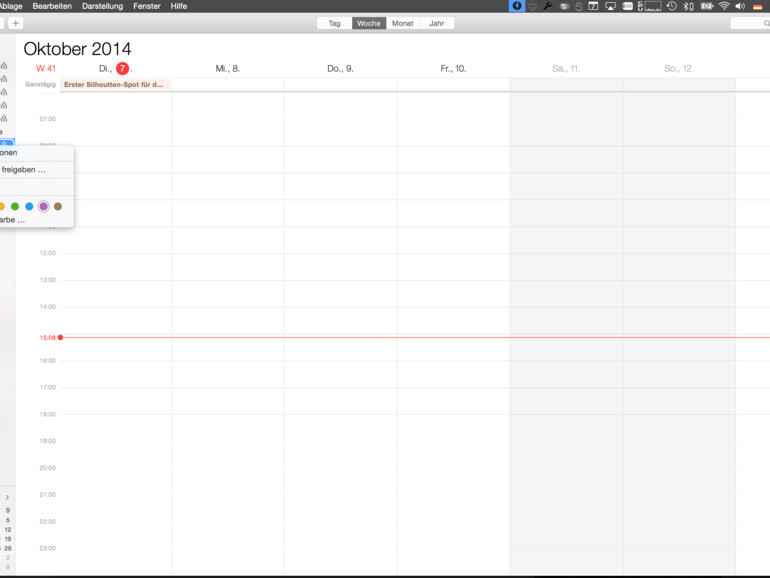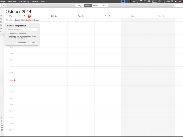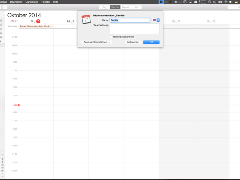 Der Yosemite-Kalender hat vor allem an vielen versteckten Stellen dazugelernt. Wenn Sie beispielsweise einen neuen Termin anlegen und anfangen zu tippen, durchsucht der Kalender im Hintergrund all Ihre bisherigen Termine, überprüft, ob es bereits vergleichbare Einträge gibt und macht daraufhin Vorschläge. Diese beziehen sich nicht nur auf den bloßen Namen des Eintrags, sondern beispielsweise auch auf die Zeiten. Wenn Sie sich bereits in den letzten zwei Monaten immer mal wieder abends mit Nina zum Essen um 18:30 Uhr verabredet haben, wird der Kalender Ihnen genau diese Uhrzeit vorschlagen, wenn Sie anfangen „Abendessen mit Nina“ zu tippen.
