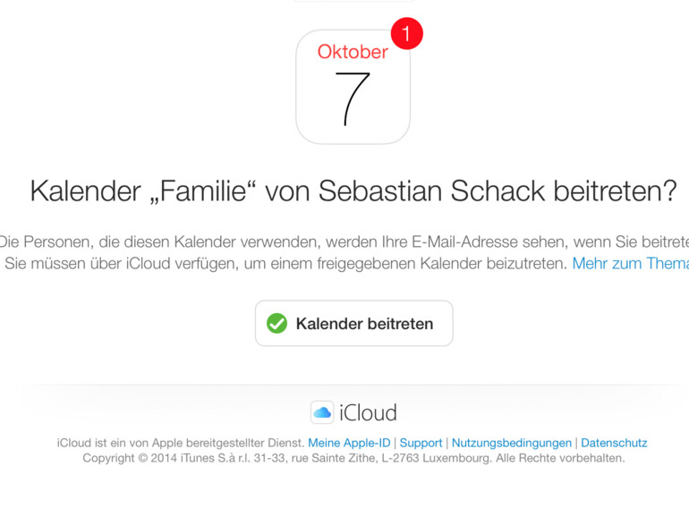 7. Eine Einladungs-E-Mail für einen solchen freigegebenen Kalender sieht so aus. Mit einem Klick auf den Schalter „Kalender beitreten“ wird die eingeladene Person in die eigene Kalender-Applikation weitergeleitet.