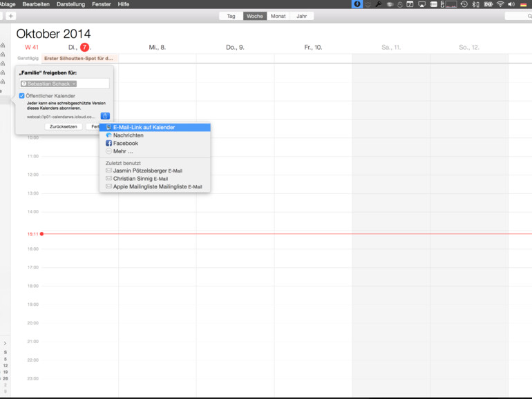 9. Über das Teilen-Symbol können Sie den Link zu Ihrem öffentlichen Kalender direkt per E-Mail, Nachrichten, Facebook oder über andere in den Systemeinstellungen hinterlegte Dienste mit anderen teilen.