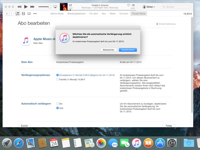 Apple gibt sich großzügig: Ganze drei Monate darf Apples Musik-Angebot kostenlos ausprobiert werden. Doch es gibt einen kleinen Haken: Endet der großzügig bemessene Probezeitraum, wird die bei iTunes hinterlegte Zahlungsmethode automatisch für den ersten Monat des regulären Abonnements belastet. Um diese von Apple voringestellte Abo-Verlängerung zu umgehen, öffnen Sie zuerst iTunes. Öffnen Sie dann mit einem Klick auf Ihren Namen links neben dem Suchfeld die „Accountinformationen“. Sie müssen sich nun authentifizieren, in dem Sie die gewählte Apple-ID durch Eingabe des Passwortes und einen Klick auf „Account überprüfen“ bestätigen. Scrollen Sie nun bis zu den „Einstellungen“ und klicken Sie dort neben „Abos“ auf „Verwalten“. Hier werden alle abgeschlossen Abos gelistet. Klicken Sie bei „Dein Abo/Apple Music-Abo“ auf „Bearbeiten“ und wählen Sie unter „Automatisch verlängern“ die Checkbox „Aus“. Bestätigen Sie diese Wahl im daraufhin erscheinenden Fenster mit einem Klick auf „Deaktivieren“. Ab sofort haben Sie es selbst im Griff, ob und wann Sie Ihr Abo verlängern.