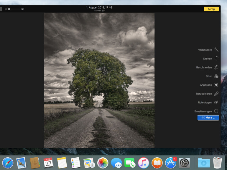 Die „Fotos“-App in iOS 9 und OS X El Capitan ermöglichen ab sofort auch den Zugriff auf Werkzeuge von Drittherstellern. Unterstützt eine Foto-Anwendung aus dem Mac App Store sogenannte Erweiterungen, lassen sich deren Funktionen direkt aus der „Fotos“-App heraus verwenden. Dabei lassen sich sogar mehrere Bearbeitungsfunktionen verschiedener Dritthersteller-Erweiterungen miteinander kombinieren – und das alles im Zusammenspiel mit den seitens Apple integrierten Funktionen zur Bildbearbeitung. Um eine Erweiterung zu verwenden, doppelklicken Sie zuerst da gewünschte Foto und klicken Sie dann rechts oben im Programmfenster auf „Bearbeiten“. Zugriff auf die Erweiterungen erhalten Sie mit einem Klick über den gleichnamigen Menüpunkt ganz unten am rechten Fensterrand.