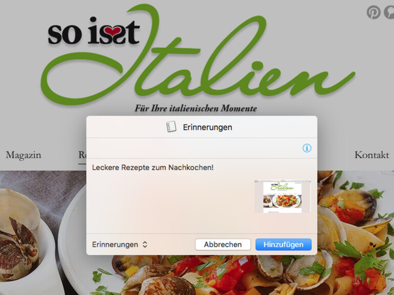 OS X El Capitan fügt dem „Teilen“-Menü in Safari, welches gleich rechts neben der Adressleiste zu finden ist, neue Ziele hinzu. Drücken Sie auf einer beliebigen Website testweise auf die „Teilen“-Taste und wählen Sie „Erinnerungen“, um den Link zur aktuell geöffneten Seite der gleichnamigen App hinzuzufügen. Sinnvoll ist das beispielsweise bei einem Rezept, das man zuhause nachkochen möchte.