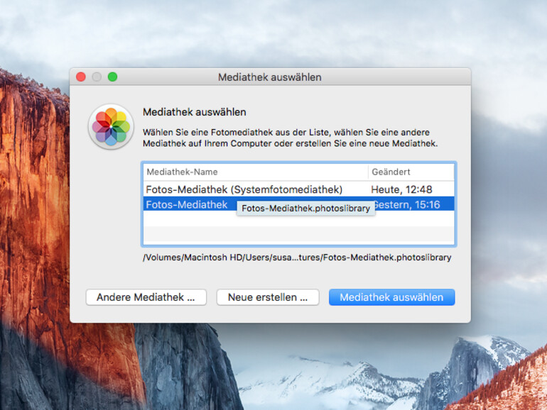 Spätestens mit dem Update auf OS X El Capitan bietet sich der Wechsel von iPhoto auf die „Fotos“-App an, denn sowohl iPhoto als auch Aperture werden nicht länger weiterentwickelt. Und genau deshalb sollte man die eigene Fotobibliothek in Apples neue Anwendung zur Fotoorganisation und Bildbearbeitung übertragen. Wenn Sie nur eine iPhoto-Bibliothek besitzen, geschieht dies beim ersten Start der „Fotos“-App automatisch. Wenn Sie hingegen über mehrere Bibliotheken verfügen, fragt die App nach, welche Bibliothek importiert werden soll. Um eine Bibliothek nach dem ersten Start manuell zu wählen, starten Sie die Fotos-App bei gedrücktgehaltener Wahltaste. Markieren Sie nun die Mediathek, die geöffnet werden soll. Ist die gewünschte Mediathek nicht aufgeführt, klicken Sie auf „Andere Mediathek“. Navigieren Sie zur gewünschten Mediathek, und klicken Sie auf „Öffnen“. Sie können die zu öffnende Mediathek alternativ auch auf das „Fotos“-Programmsymbol im Dock ziehen. Fotomediatheken finden Sie in aller Regel unter „Bilder“ in Ihrem Benutzerordner.