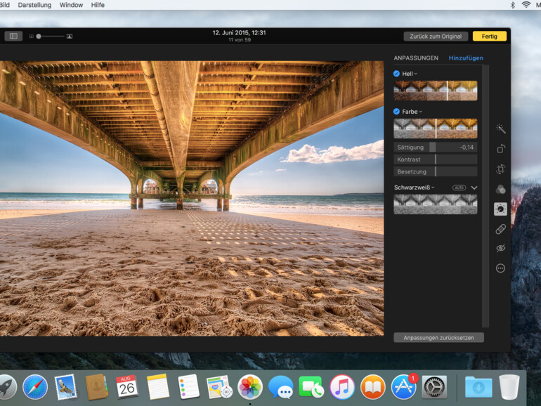 Die „Fotos“-App verwandelt Ihren Mac in einen digitale Dunkelkammer. So lassen sich auch nachträglich Parameter wie etwa die Belichtung und Sättigung einer Aufnahme verändern. Es ist sogar möglich, ein Farbfoto mit nur einem Klick in eine stimmungsvolle Schwarzweiß-Aufnahme zu verwandeln. Um solcherlei Anpassungen vorzunehmen, öffnen Sie zuerst die „Fotos“-Anwendung und wählen das gewünschte Bild per Doppelklick aus. Klicken Sie nun in der rechten oberen Bildschirmecke auf „Bearbeiten“ und daraufhin auf das den „Anpassen“-Modus visualisierende Drehregler-Icon am rechten Fensterrand. Wählen Sie dann die gewünschte Kategorie. Unter „Hell“, „Farbe“ und „Schwarzweiß“ hat Apple einige Parameter clever zu sogenannten Makros zusammengefasst. Ziehen Sie den eingeblendeten Schieber in der jeweiligen Kategorie nach links oder rechts, um Werteveränderungen vorzunehmen. Deren Auswirkungen lassen sich dabei live mitverfolgen. Sie können die in den genannten Makros zusammengefassten Parameter darüber hinaus auch einzeln manipulieren. Bewegen Sie den Mauszeiger hierfür einfach über das gewünschte Feld, etwa „Hell“, und blenden Sie dann die einzelnen Parameter durch einen Klick auf das nun erscheinende „Pfeil nach unten“-Symbol ein. Alternativ können Sie die App automatisch passende Einstellungen ermitteln lassen – klicken Sie hierzu auf das jeweilige „Auto“-Symbol. Wenn Sie mit den Anpassungen zufrieden sind, drücken Sie zum Speichern auf die gelbe „Fertig“-Schaltfläche links oben im Programmfenster.