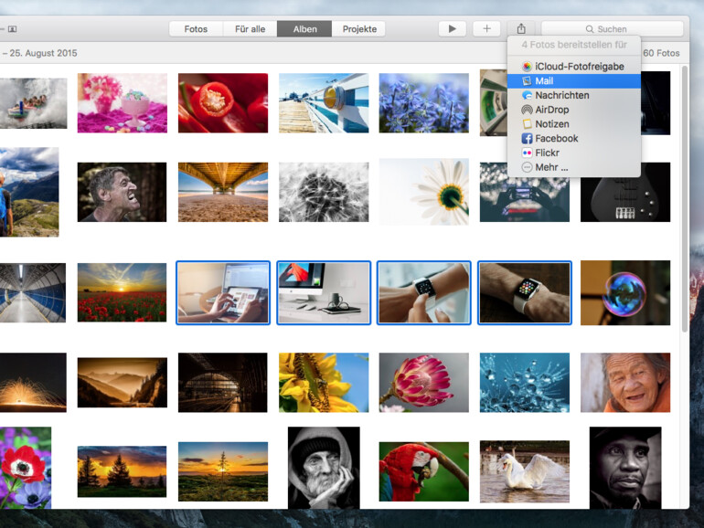 Geteilte Freude ist doppelte Freude. Deshalb bereiten Fotos vor allem dann Spaß, wenn man sie mit Freunden, Kollegen, Bekannten und der Familie teilen kann – etwa mit der „Fotos“-App. Öffnen Sie hierzu zunächst die App und wählen Sie dort das zu teilende Bild aus. Alternativ können Sie auch gleich mehrere Bilder markieren oder ein Album auswählen. Klicken Sie dann auf das „Teilen“-Symbol, welches Sie links neben dem Eingabefeld für die Suche finden. Im sich nun öffnenden Menü können Sie Ihr Bild, Ihre Bilder beziehungsweise Ihr ausgewähltes Album beispielsweise direkt an Mail, die Nachrichten-App, Facebook und Flickr überreichen und so im Handumdrehen veröffentlichen.
