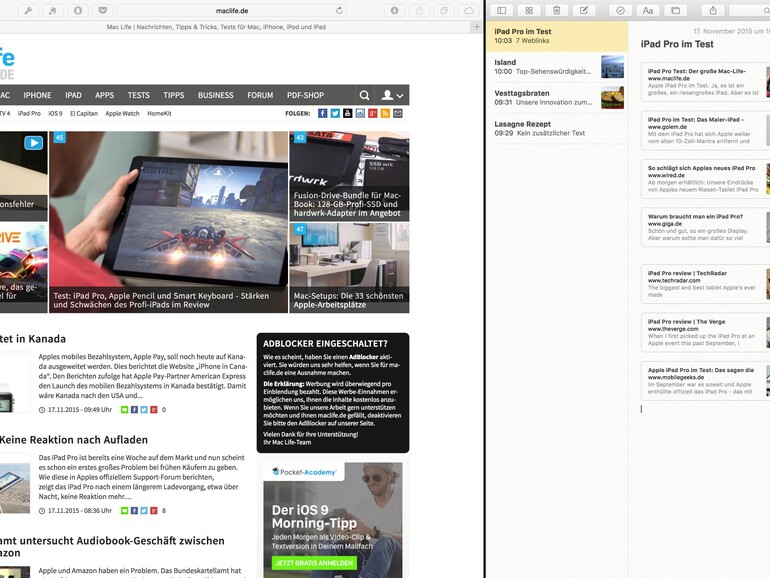 Wie der Vollbild-Modus für eine einzelne App wird bei Split View das Dock und die Menüleiste ausgeblendet. Dadurch werden Platz geschaffen und Ablenkungen entfernt. Statt mit Gesten zwischen zwei Apps im Vollbild-Modus zu wechseln, verbessert Split View die Produktivität; Sie können links einen Text-Editor öffnen und rechts daneben Safari für Recherchen laufen lassen.