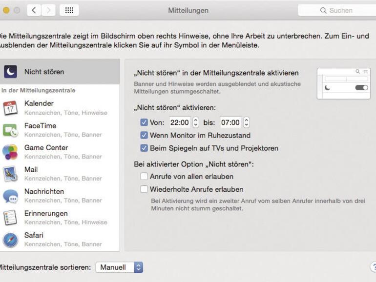 In den Einstellungen der Mitteilungszentrale können Sie ein Zeitfenster definieren, in dem Sie grundsätzlich nicht durch Benachrichtigungen gestört werden möchten. Sie können außerdem festlegen, dass Benachrichtigungen während Präsentationen deaktiviert werden.
