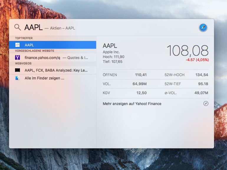 Die Suchfunktion Spotlight lernt beständig neue Tricks. Suchen Sie doch einmal nach „Wetter“ für die Anzeige des lokalen Wetters, „Wetter Kiel“ für das Wetter in einer anderen Stadt, hier beispielsweise Kiel, und „AAPL“ für den aktuellen Kurs der Apple-Aktie. Auch Videoclips auf YouTube und Vimeo lassen sich so finden, etwa „Mad Max Fury Road Trailer YouTube“.