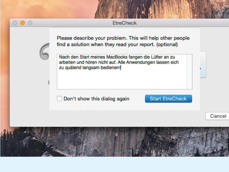 Nach dem Start bietet EtreCheck die Möglichkeit, eine Fehlerbeschreibung einzugeben. Diese kann zusammen mit Diagnose-Ergebnisse weitergegeben werden, um Hilfe bei der Lösung eines Problems zu erhalten.