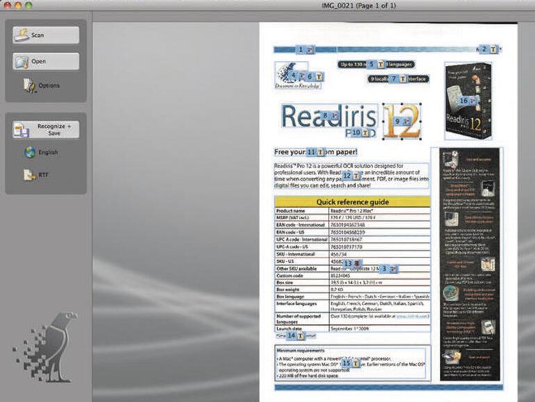 Bei ReadIris Pro handelt es sich um den „Dinosaurier“ unter den OCR-Programmen – nicht nur auf dem Mac, auch unter Windows. ReadIris Pro für den Mac war einst berüchtigt für seine etwas lieblose und unstrukturierte Benutzeroberfläche. Seit der aktuellen Version 12 hat sich diesbezüglich einiges zum Positiven verändert. Die Erkennungsrate ist ebenfalls recht hoch und das Programm arbeitet schnell und hat kaum Probleme mit aufwändig formatierten Texten. Aber Vorsicht! ReadIris Pro hat eine Begrenzung auf 50 Seite pro Scandurchgang.