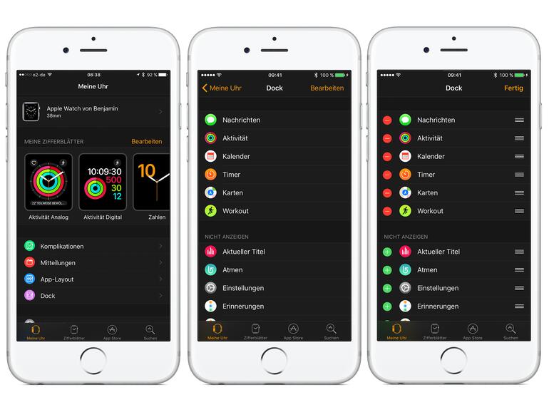 Nehmen Sie zunächst Ihr iPhone zur Hand und öffnen Sie die Watch-App. Tippen Sie den neuen Menüpunkt „Dock" an. Jetzt sehen Sie oben sämtliche Apps, die im Dock hinterlegt sind, während darunter alle nicht angezeigten Apps zu finden sind. Tippen Sie auf „Bearbeiten"