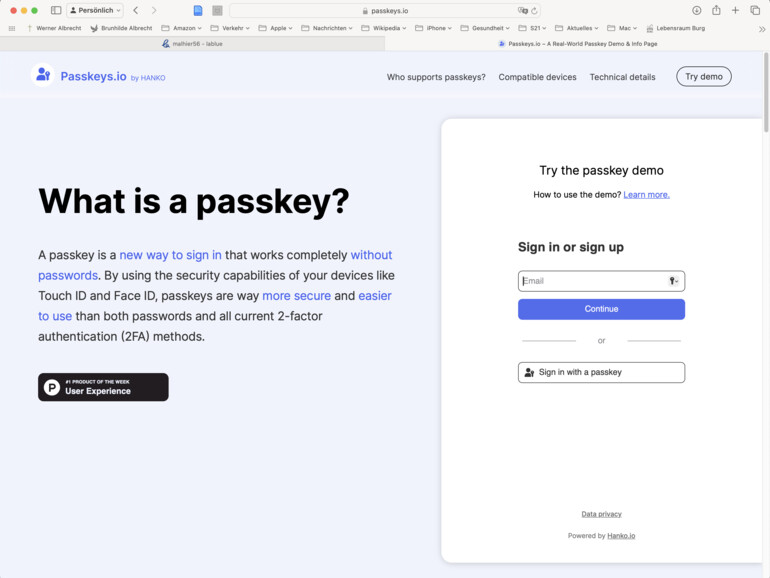 Dann klickst du dort auf "Sign up" sowie "Continue". Daraufhin startet die Generierung des Passkeys. Folge den englischsprachigen Anweisungen.