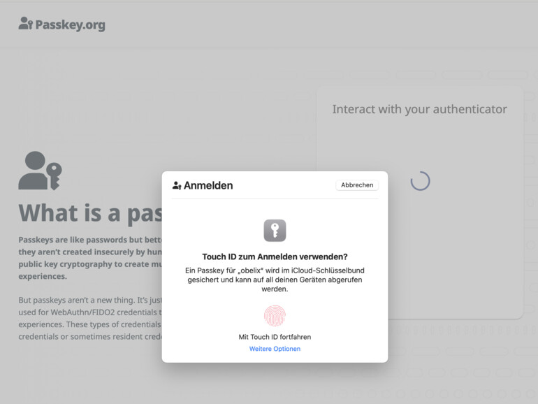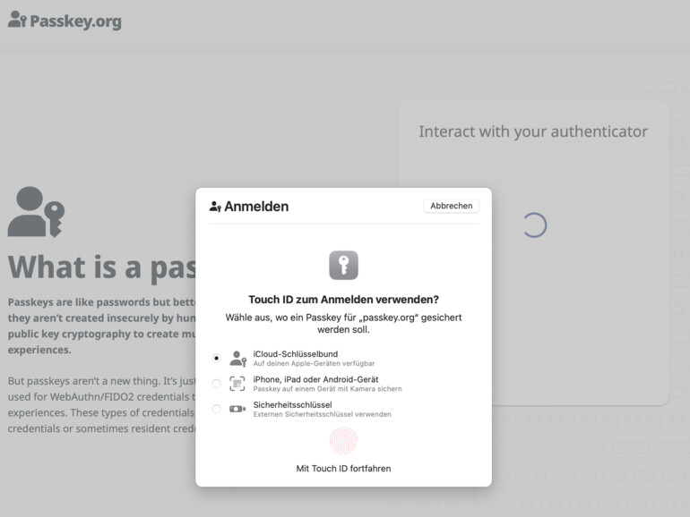 Dir wird angeboten, wo der Passkey gespeichert werden soll, hier kannst du deinen Mac wählen. Authentifiziere dich mit Touch-ID, dann wird dieser im iCloud-Schlüsselbund gesichert.