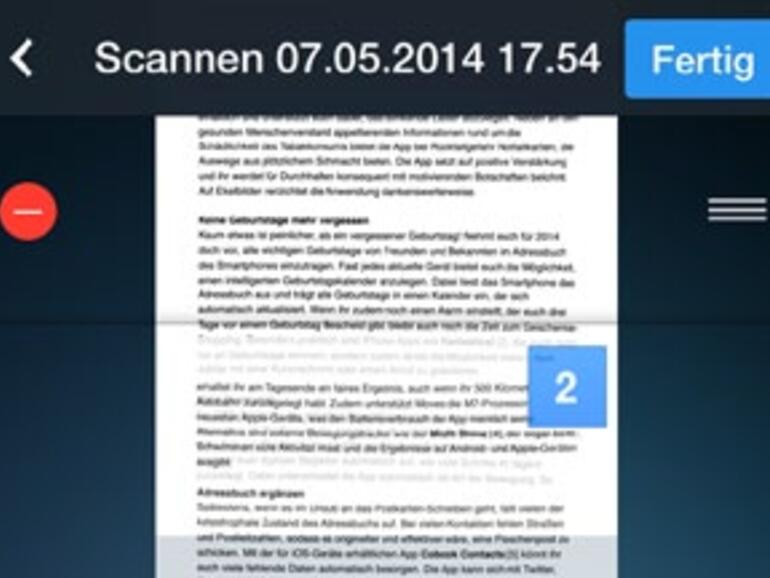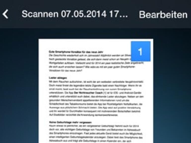 Bereits vor dem Scannen begeistert Scanner Pro by Readdle (5,99 Euro) mit einer automatischen Kantenerkennung. Wird das iOS-Gerät ruhig über dem Dokument gehalten, landet später nur das Wesentliche im Scan – eine händische Korrektur ist möglich, aber selten nötig. Schießen Sie mehrere Bilder in Serie, erstellt die App automatisch ein PDF, wobei Sie die Seitenreihenfolge nachträglich umstellen können. Das fertige Dokument ist hervorragend lesbar und benötigt wenig Speicherplatz.