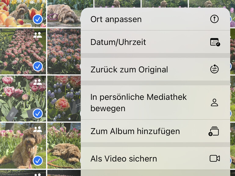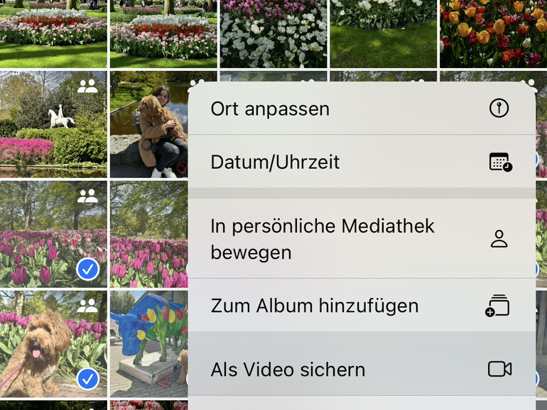Öffne dazu die Fotos und wähle im Reiter „Alben“ den Ordner „Live Photos“ aus. Dort angekommen, tippst du oben rechts auf „Auswählen“ und setzt deine Haken bei den Aufnahmen, die du zu einem Video zusammenfügen möchtest. Anschließend tippst du rechts unten auf das Symbol mit den drei Punkten. Wähle die Option „Als Video sichern“ aus und schon wird dein eigenes kleines Video erstellt. Die Live Photos bleiben dabei erhalten.