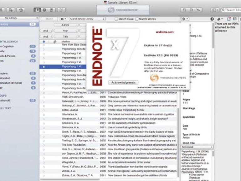 Selbstverständlich ist das Programm auch in der Lage, Kommentare, Schlagwörter oder Anhänge wie beispielsweise PDF-Dateien zu verwalten. Die Zusammenarbeit mit Textverarbeitungsprogrammen ist in der Regel ohne größere Probleme möglich. Literaturangaben können direkt eingefügt werden. Eine Bibliografie lässt sich ebenso erstellen. Auch die Rechercheund Verwaltungsfunktionen lassen nichts zu wünschen übrig. EndNote erfordert allerdings eine umfassende Einarbeitung. Der Erwerb lohnt sich daher nur für umfangreiche wissenschaftliche Arbeiten oder für professionelle Anwender im universitären oder wissenschaftlichen Umfeld.
