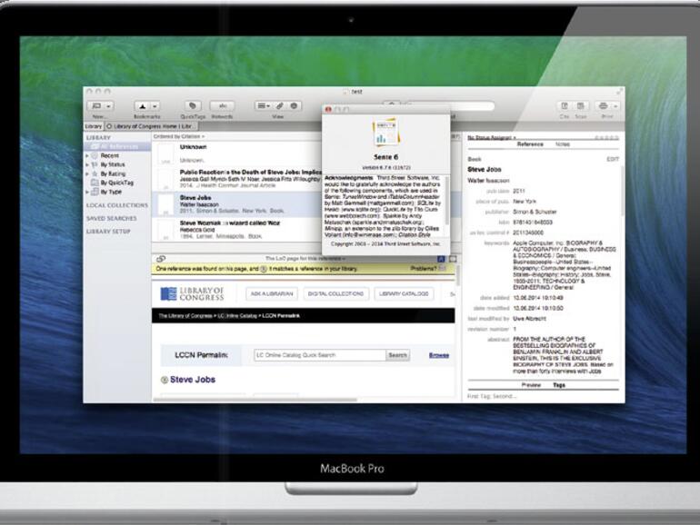 ist bei der kostenlosen Variante die Größe der Datenbank beschränkt. Ansonsten werden knapp 60 Euro fällig, um diese Einschränkung zu umgehen. Neben der händischen Eingabe von Literaturtiteln kann natürlich auch die praktische Onlinesuche verwendet werden. Hierbei listet das Programm nicht nur die gewünschten Literaturtitel auf, es wird im integrierten Web-Browser auch die entsprechende Bibliotheksfundstelle angezeigt. Neben der Suche über einen Begriff kann die gewünschte Literatur beispielsweise auch anhand der ISBN-Nummer oder anderer Kriterien recherchiert und in die Datenbank übernommen werden. Eine Zusammenarbeit mit Word und anderen Textverarbeitungsprogrammen ist möglich. Das Programm ist zwar etwas einfacher zu bedienen als EndNote, eine gewisse Einarbeitungszeit, um das dahinterliegende Prinzip – vor allem was die Zusammenarbeit mit Textverarbeitungsprogrammen anbelangt – zu verstehen, ist aber dennoch erforderlich. Übrigens: Falls Sie ein iPad besitzen, gibt es eine passende App, sodass die Literaturdatenbank zwischen Mac und iPad abgeglichen werden kann.