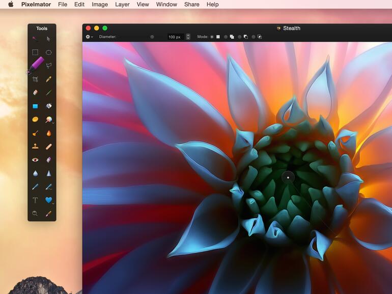 Genau wie das große Vorbild Adobe Photoshop kommt auch Pixelmator mit einer großen Palette an Werkzeugen. Im oberen Bereich der Palette finden Sie die klassischen Werkzeuge zur Auswahl von Bereichen. Vom Zauberstab bis zum Polygon-Werkzeug ist alles dabei, was das Herz begehrt. Darunter befinden sich ebenfalls alte Bekannte wie Tools zum Zu- und Beschneiden, oder zum Radieren. Tiefer in die Bildmanipulation einsteigen kann man dann mit dem Pinsel-, dem Verlauf- und dem Füllen-Werkzeug. Vor allem aber mit dem Quartett Schwamm, Verkrümmen, Abwedeln und Brennen. Im unteren Bereich finden Sie dann wieder klassischere Werkezug wie den Stempel, das Reparieren-Werkzeug und Helfer für Formen oder Texte.