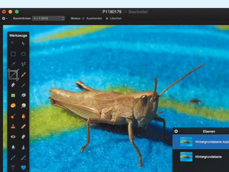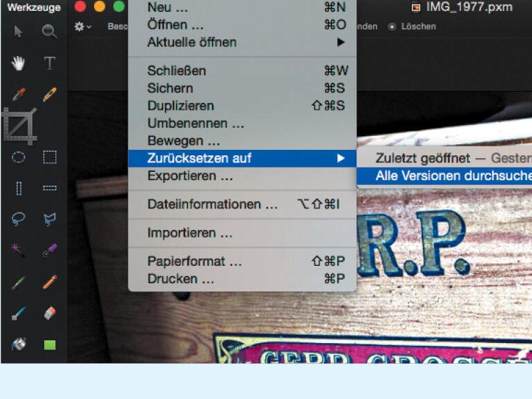 Haben Sie ein Dokument bereits mehrfach unter gleichem Namen gesichert und wollen trotzdem zu einer früheren Version zurück, bietet Pixelmator Ihnen die „Zurücksetzen auf“-Funktion im Ablage-Menü. Dort wählen Sie per Mausklick eine der zuletzt gesicherten Versionen aus dem Aufklappmenü aus, oder lassen sich mit dem Befehl „Alle Versionen durchsuchen…“ im gleichen Menü eine Art Time-Machine-Übersicht zeigen. Dann öffnet sich ein Vorschaufenster und erlaubt das Durchblättern aller gesicherten Bildversionen. Für die bessere Übersicht blendet Pixelmator auf der linken Seite das derzeitige Bild ein. Haben Sie das gewünschte alte Bild gefunden, kehren Sie mit dem „Wiederherstellen“-Befehl zu dieser Version zurück.