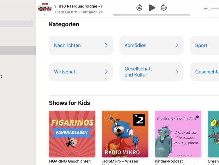Das Angebot an Podcasts ist enorm groß. Eine riesige Zahl an Kanälen bieten regelmäßig neue Beiträge an – hier wird wirklich für fast alle allgemeinen und speziellen Interessen etwas geboten. Oft erfährt man von Podcasts etwa auf Webseiten, weshalb man auch mit dem „Ablage“-Menü eine URL hinzufügen kann. Ansonsten sortiert Apple die Podcasts nach Kategorien und bietet zudem eine Suchfunktion. Hat man einen interessanten Kanal gefunden, kann man per Abo neue Folgen automatisch laden.