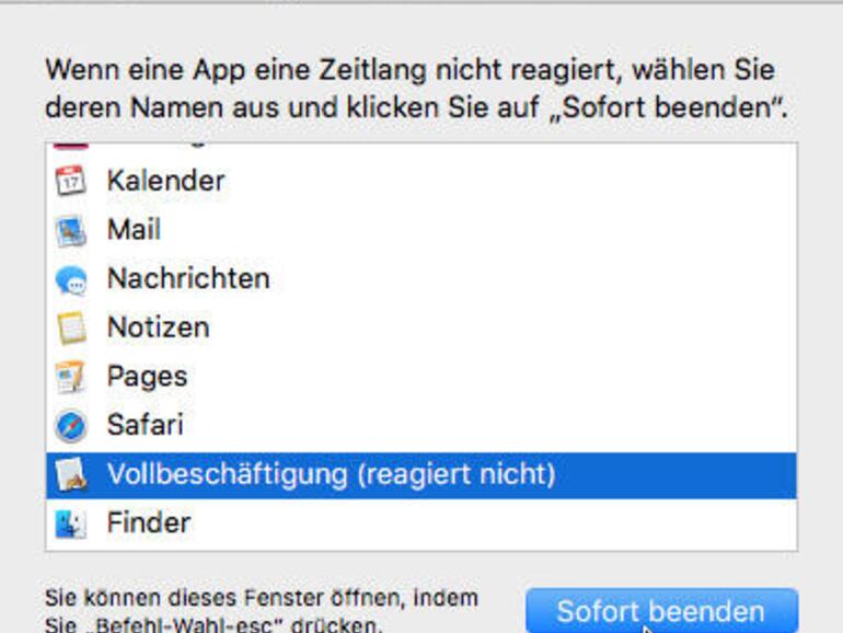 Reagiert ein Programm nicht mehr auf Eingaben, bleibt dir nur, es zwangsweise zu beenden. Dazu rufest du im Apfelmenü „Sofort beenden“ auf oder drückst Befehl-Alt-Escape („cmd-alt-esc“). OS X zeigt dann in einem Fenster alle laufenden Apps. Hält das System eine für abgestürzt, wird ihr Name rot dargestellt, mit dem Hinweis „reagiert nicht“ dahinter. Um ein Programm zu beenden, wählst du es in der Liste aus und klickst auf „Sofort beenden“. OS X warnt noch einmal, dass ungesicherte Änderungen verloren gehen, dann kannst du der App den Saft abdrehen.