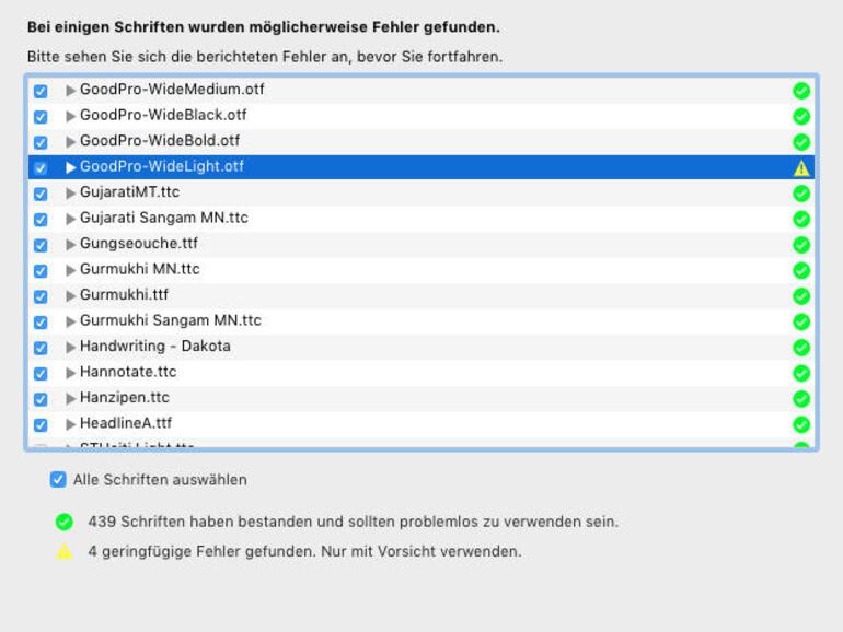 Probleme mit benutzereigenen Schriften lassen sich über die Anmeldung mit einem neuen Account ausschließen. Wurden Schriften jedoch im allgemeinen Library-Ordner auf der obersten Ebene des Startlaufwerks installiert, sind sie für alle Benutzer nutzbar. Um die Integrität aller Fonts zu prüfen, öffnest du das Programm Schriftsammlung. Markiere alle Fonts, und wähle den Menübefehl „Ablage > Schriften überprüfen“. Die App untersucht nun die ausgewählten Fonts auf Fehler. Die Bewertung erfolgt nach einem Ampelschema, wobei Gelb „Vorsicht“ bedeutet und rot markierte Fonts ersetzt werden sollten.