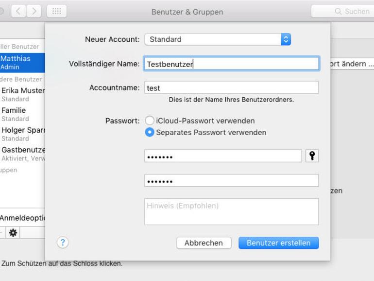 Klicke auf die Plustaste unter der Benutzerliste, und wähle im Aufklappmenü „Neuer Account“ den Typ „Standard“. Der neue Benutzer erhält einen frischen Library-Ordner. Melde dich als der neue Benutzer an. Funktioniert das Programm nun, ist vermutlich eine der oben genannten Ursachen Schuld – zumindest liegt die Ursache im Benutzerordner.