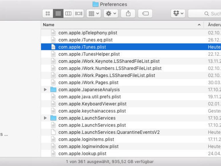 Häufig ist nur eine defekte Einstellungsdatei des Benutzers schuld. Lässt also der Benutzerwechsel das Problem verschwinden, solltest du dir die Voreinstellungen vorknöpfen. Die zugehörige Datei findest du im privaten Library-Ordner. Beende die App. Halte im Finder beim Öffnen des Menüs „Gehe zu“ die Wahltaste gedrückt, und öffne „Library“. Darin öffnest du dann „Preferences“. Der Name der Vorgabedatei beginnt meist mit der umgedrehten URL des Herstellers, zum Beispiel „com.apple.itunes“ für iTunes, und endet mit plist. Einige Apps legen auch einen Ordner an. Löschst du die Datei, legt die App beim nächsten Start eine neue an.