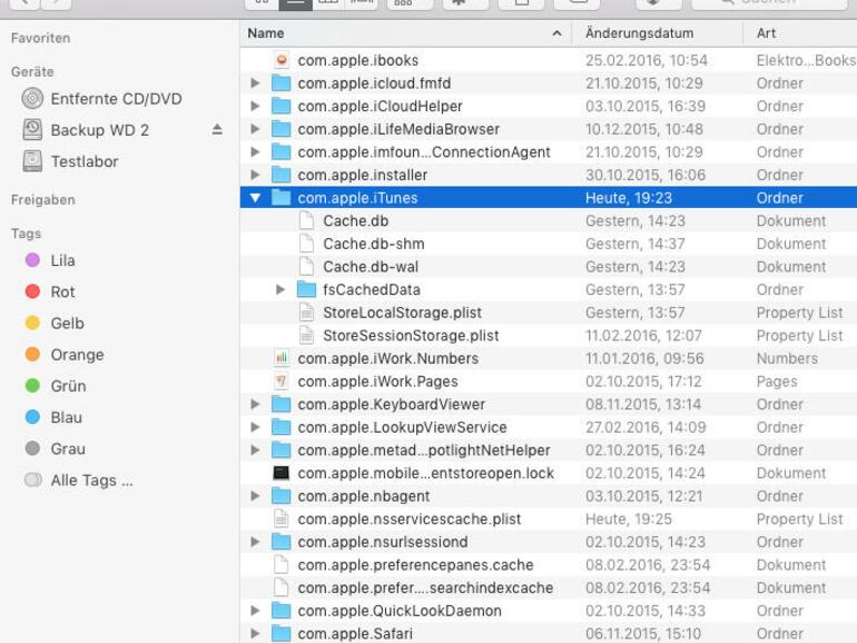 Auch Programme verwenden Cache-Dateien, um schneller auf bestimmte Informationen zugreifen zu können. Sie sparen sich so zum Beispiel beim Programmstart diverse Festplattenzugriffe, die das Öffnen der App verzögern würden. Hat sich in den Cache ein Fehler eingeschlichen, kann das zu Problemen führen. Löscht man die Datei, legt die App sie beim nächsten Start neu an. Das dauert etwas länger, sorgt aber wieder für saubere Daten. Zum Löschen beendest du die App und öffnest den Ordner „Caches“ im Library-Ordner des Benutzers. Darin entfernst du die zur App gehörigen Dateien oder Ordner. Dann startest du die App wieder.