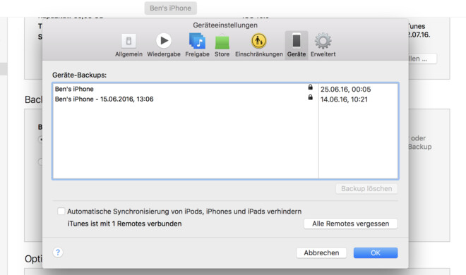 Nachdem das Backup erstellt wurde, klickst du in der Menüleiste am oberen Bildschirmrand auf „iTunes“ und wählst „Einstellungen“ aus. In den Einstellungen wechselst du nun zum Reiter „Geräte“. Hier siehst du deine Geräte-Backups. Rechtsklicke auf dein eben erstelltes Backup und klicke auf „archivieren“, um es vor dem Löschen beziehungsweise dem Überschreiben zu schützen.