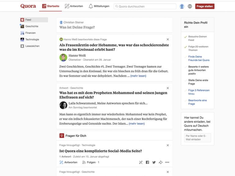 Nach der Registrierung gelangen Sie auf die Startseite von Quora. Hier gibt es einen allgemeinen Feed mit Fragen und Antworten. Diese bündeln sich aus den von Ihnen angegebenen Interessen. Sie können auch Themen und Nutzern der Plattform folgen. Unter „Antworten“ schlägt Ihnen die Plattform Fragen vor, die Sie eventuell selbst beantworten möchten. Die Mitteilungen halten Sie auf dem Laufenden über Ihre eigenen Fragen, Antworten und Kommentare.