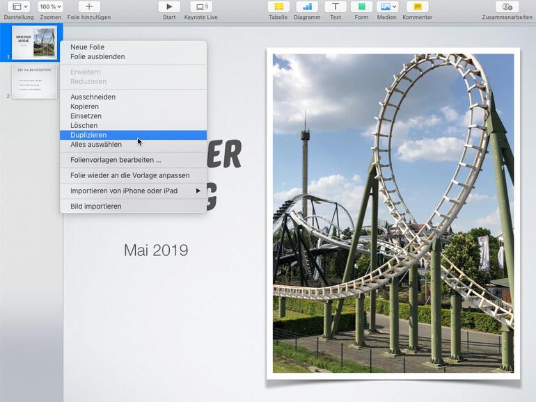 Folie duplizierenDer Zauberei-Effekt animiert Änderungen an Objekten beim Folienwechsel automatisch. Wählen Sie eine Folie links in der Übersicht und duplizieren Sie diese. Entfernen oder Ergänzen Sie Inhalte auf der neuen Folie.