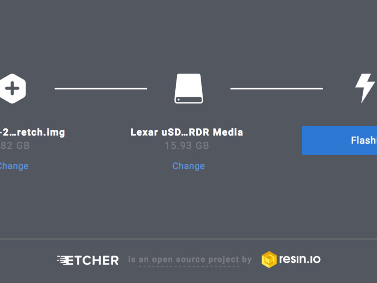 Starten Sie jetzt Etcher, um das Image des auf Linux basierenden Raspbian-Betriebssystems auf die bereitgestellte microSD-Karte zu überspielen. Stecken Sie hierzu zuerst die kleine Speicherkarte in einen mit Ihrem Mac verbundenen Kartenleser. Starten Sie nun die zuvor geladene App Etcher. Wählen Sie hier die Image-Datei mit dem Betriebssystem und dann die Speicherkarte aus. Klicken Sie abschließend auf die „Flash!“-Schaltfläche.