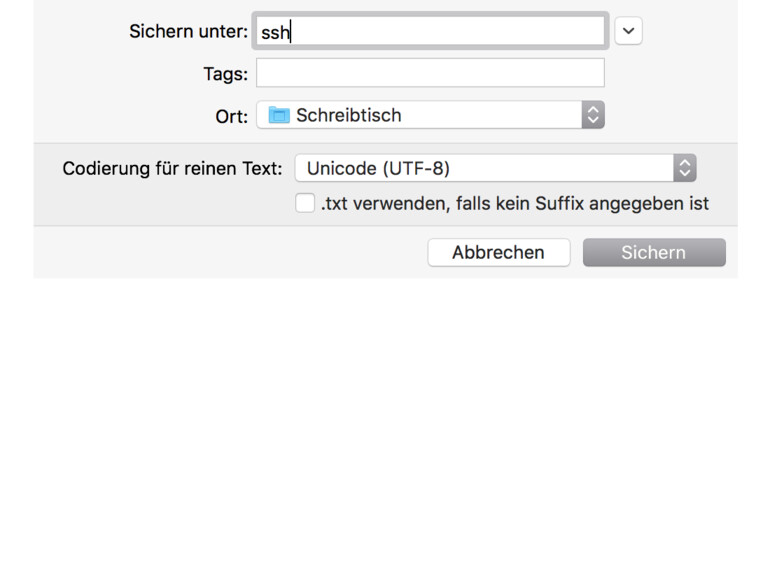 Nun müssen Sie noch einige Konfigurationsdateien ändern, um Ihren Raspberry Pi ohne eigenen Bildschirm und Tastatur zu verwenden. Hierzu muss zuerst die sogenannte Secure Shell, kurz SSH, aktiviert werden, über die Sie sich über die Terminal-App an Ihrem Mac mit dem Raspberry verbinden können. Zum Aktivieren von SSH legen Sie einfach eine leere Textdatei namens SSH auf die oberste Verzeichnisebene der Boot-Partition der Speicherkarte. Falls Ihr Mac die Speicherkarte nach dem Schritt 2 nicht „sieht“, entfernen Sie diese aus dem Leser und stecken diese erneut ein. Die Datei erstellen Sie einfach mit TextEdit -> Neues Dokument -> Format -> In reinen Text umwandeln -> Sichern. Geben Sie bei Sichern unter den Dateinamen SSH ein und entfernen Sie das Kürzel .txt, wählen Sie zudem „.txt verwenden, wenn kein Suffix angegeben ist“ ab, bevor Sie auf Speichern klicken.