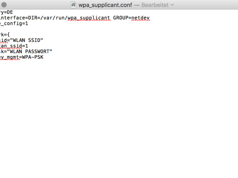 Um überhaupt erst eine Verbindung zu Ihrem Raspberry herstellen zu können, muss sich der kleine Computer mit Ihrem WLAN verbinden. Dessen Zugangsdaten müssen Sie händisch in einer Textdatei hinterlegen. Beim Booten verbindet sich der Raspi dann automatisch mit dem angegeben Funknetz. Erstellen Sie hierzu ein neuse Dokument in TextEdit und kopieren Sie folgenden Text hinein: