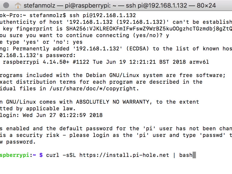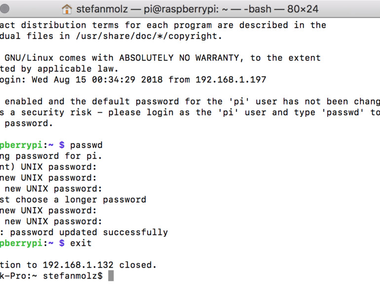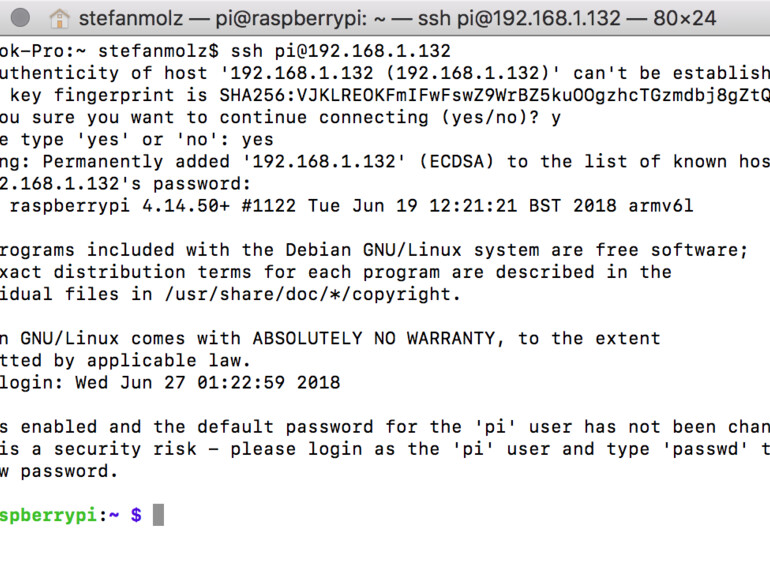 Jetzt können Sie sich auch schon über die Kommandozeile in den Raspberry einloggen. Dazu öffnen Sie das Terminal auf dem Mac und geben ssh pi@ip_adresse ein, wobei pi der Benutzername ist und IP-Adresse der Adresse des Raspis im eigenen Netz entspricht – diese Info finden sie etwa in ihrem Router. Beim Einloggen werden Sie zudem nach einem Passwort gefragt. Das Standard-Passwort eines jeden Raspberry Pis lautet schlicht raspberry.