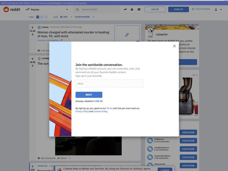Um Reddit in vollem Umfang zu nutzen, benötigen Sie ein Benutzerkonto. Das erstellen Sie auf der Startseite mithilfe der Schaltfläche „Sign Up“. Danach öffnet sich ein Fenster, in dem Sie Ihre E-Mail-Adresse eintragen.