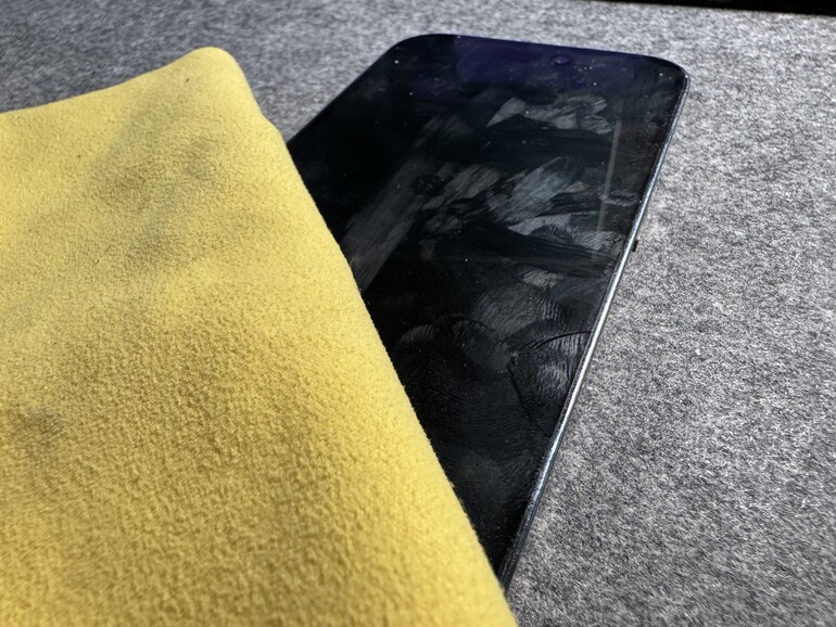 Nach der Reinigung verwende eine trockene Stelle des Tuchs, um den Bildschirm sanft nachzupolieren und eventuelle Streifen zu entfernen.