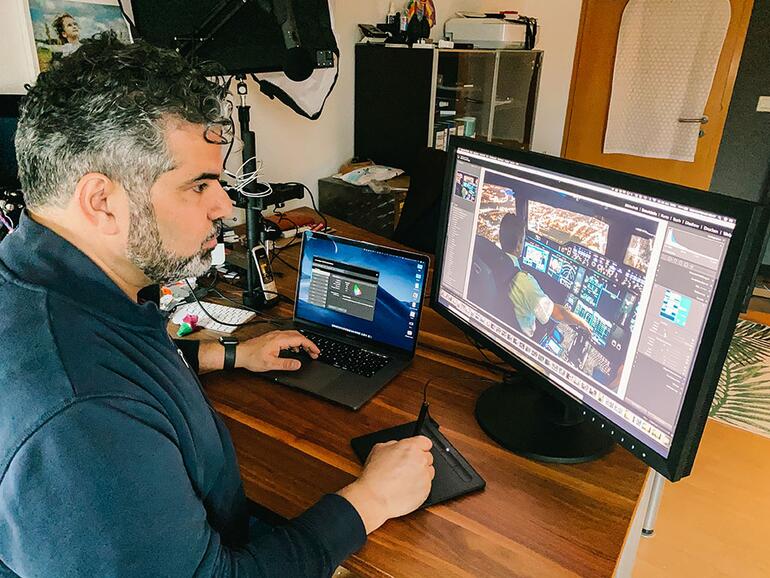 Auf einen großen und zuverlässigen Monitor wollte Abedi aber nicht verzichten: „Der Notebookbildschirm ist zur Bildbearbeitung zu klein. Die glänzende Monitoroberfläche mit der zusätzlichen Glasscheibe ist nicht wirklich ergonomisch und softprooftauglich ist mein Notebook auch nach der Kalibrierung nicht“, erklärt Abedi seine Suche nach einem ergänzenden Grafik- Monitor für seinen Desktop-Arbeitsplatz. Fündig wurde er mit dem brandneuen ColorEdge CS2731 von EIZO. „Ich verbinde mein MacBook einfach via USB-C mit dem CS2731, und schon ist der Rechner in den kompletten Desktopworkflow integriert. Peripheriegeräte wie Tastatur, Speicherkartenlesegerät oder Festplatten sind permanent am CS2731 angeschlossen und der Mac wird über das Kabel sogar mit Strom versorgt. Einfacher und komfortabler geht es wirklich nicht.“