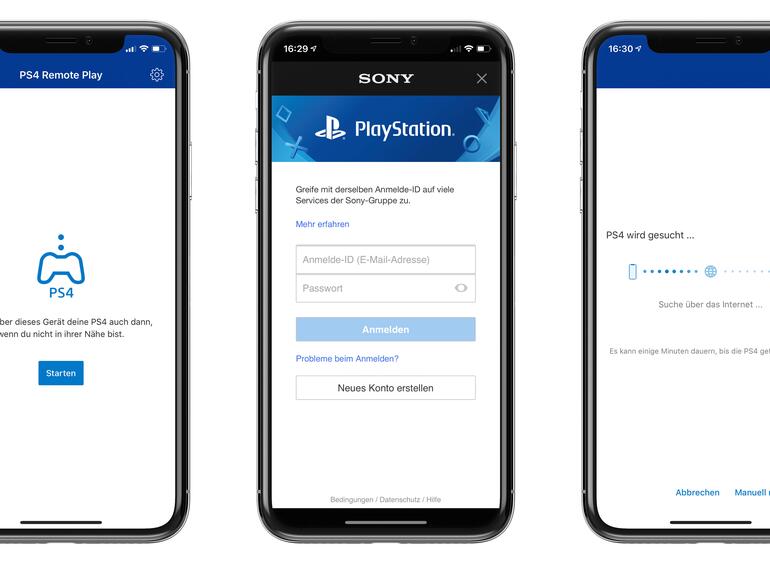 Wechseln Sie nun zurück zur Ihrem iPhone und öffnen Sie die „PS4 Remote Play“-App. Tippen Sie auf „Start“ und melden Sie sich dann in Ihrem PSN-Konto an. Ihr PS4-System wird nun gesucht.